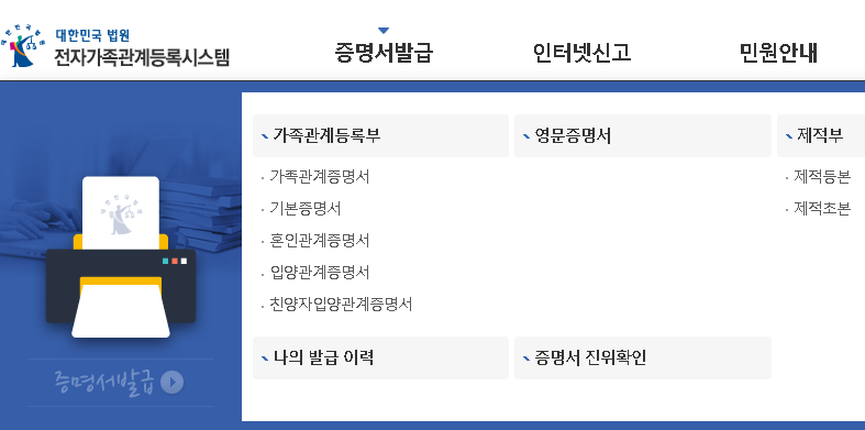 - [가족관계등록부 발급] 메뉴 클릭
